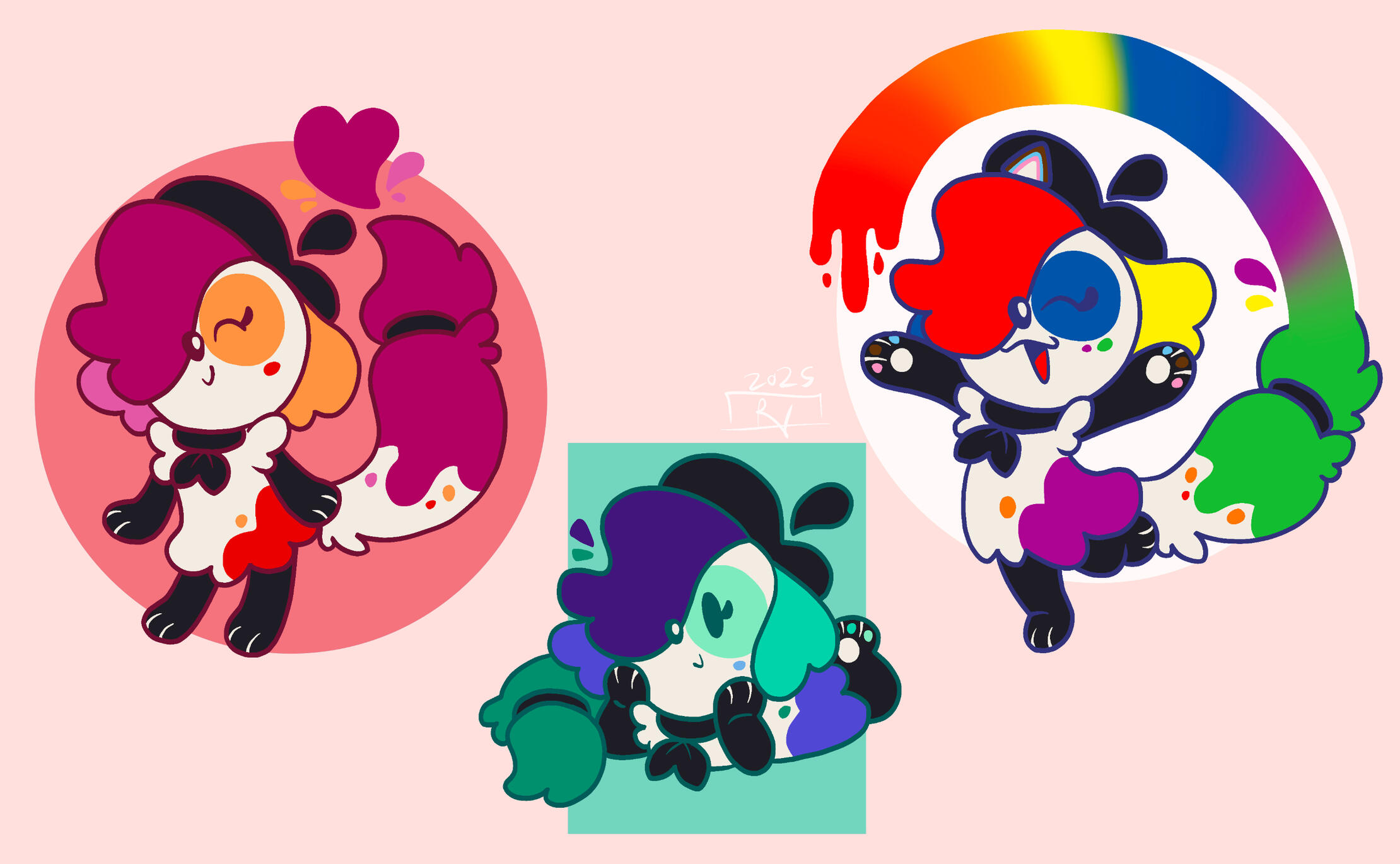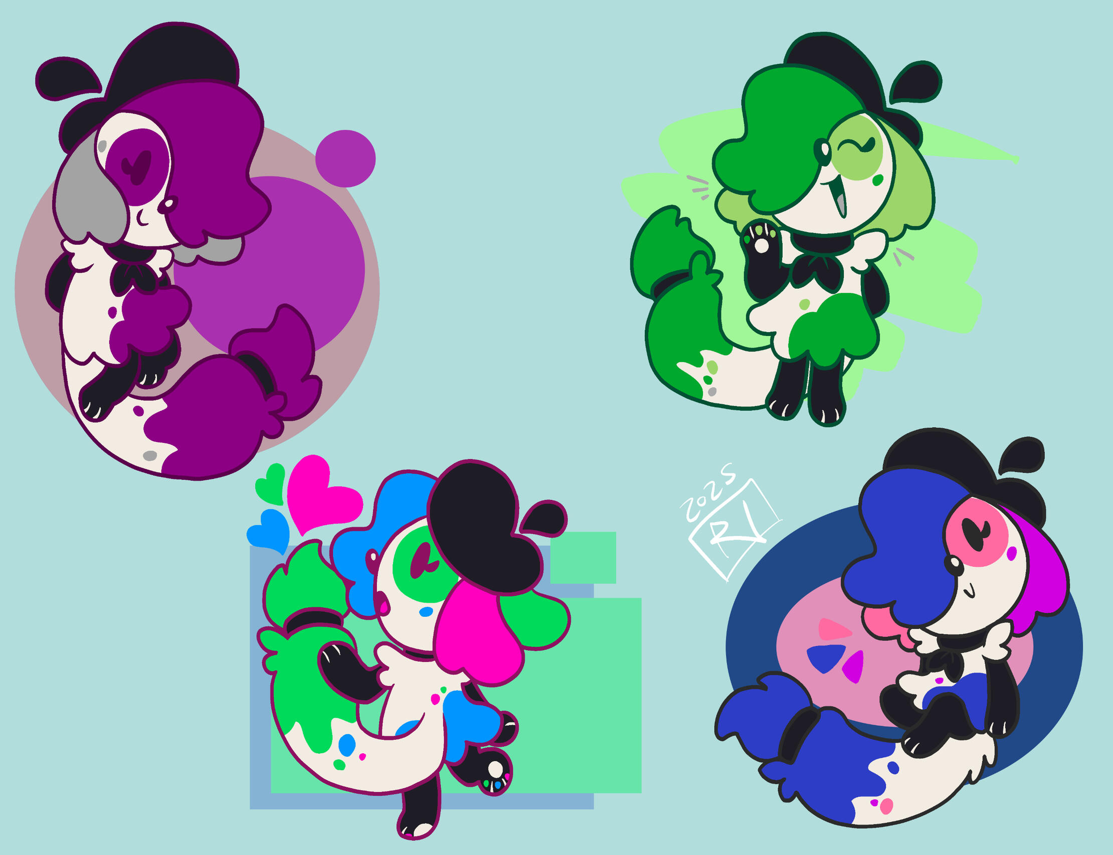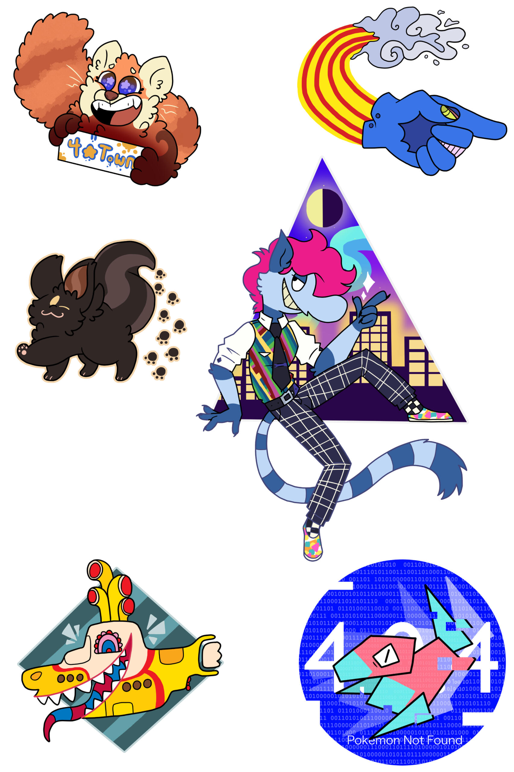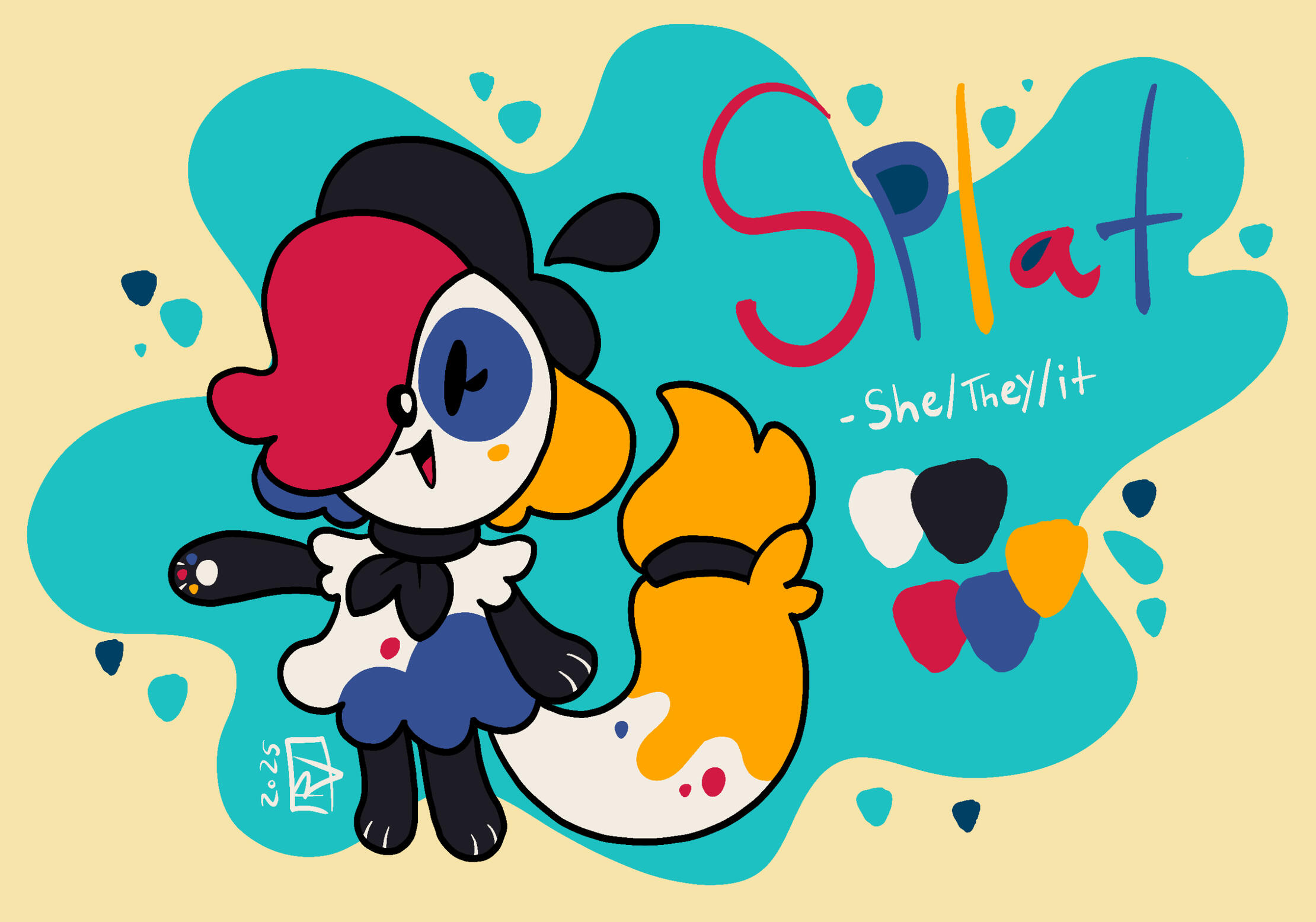 Splat has evolved from a simple character I made in 2024 to a secondary mascot due to her simple designs and how many of my friends enjoyed her greatly, so I decided to make a collection dedicated to her! These designs will all be adapted into stickers, keychains, and more!