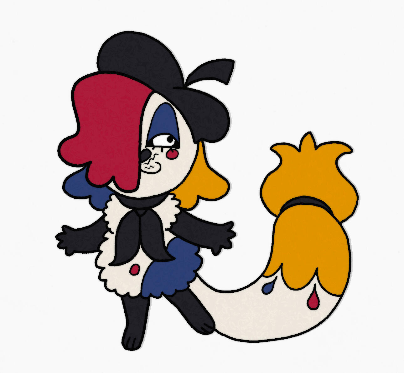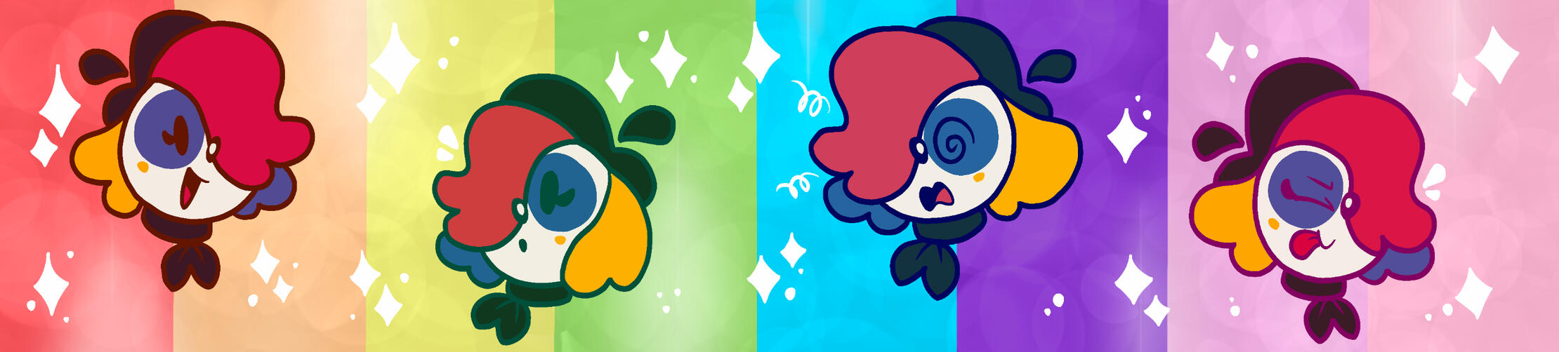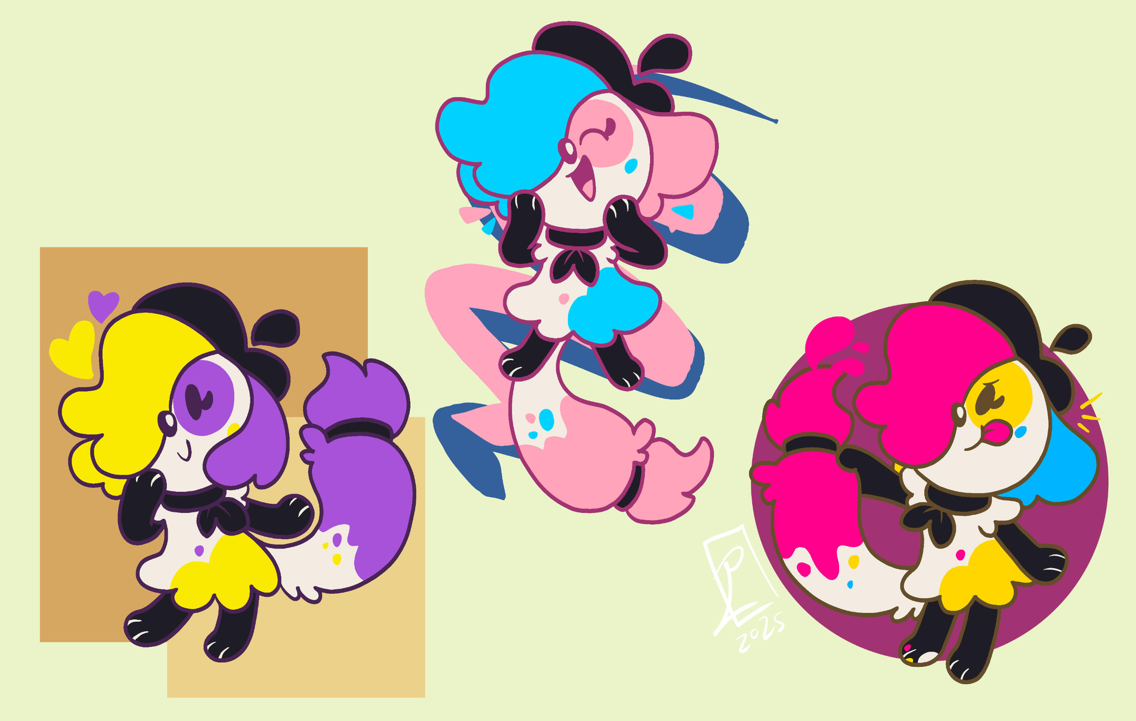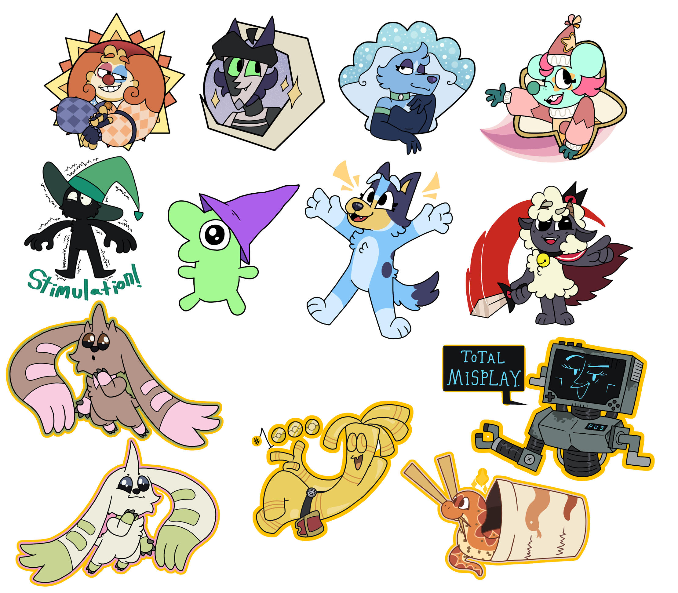 Splat has evolved from a simple character I made in 2024 to a secondary mascot due to her simple designs and how many of my friends enjoyed her greatly, so I decided to make a collection dedicated to her! These designs will all be adapted into stickers, keychains, and more!