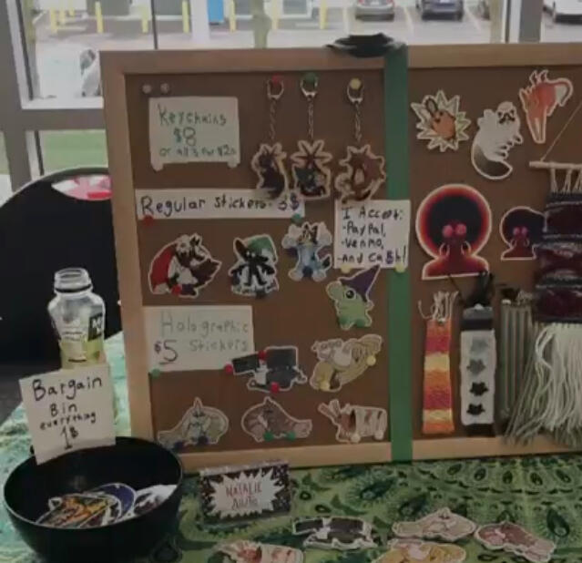 When I heard there was going to be another school-held convention the very next year (And coiencidentally, the year I was set to graduate), I was estatic about applying because I knew for sure I wanted to step up my game and get serious about making quality merchandise. Last year, I had printed using solely my school’s in-house printing services, which, while they were perfectly fine, I couldn’t do any of the fancy things I wanted to do, like holographic textures and most notably: Keychains. So, I ended up using a third-party printer to print all my work instead, and it felt really surreal to see my work on keychains for the first time. While my table was smaller, shared, and more low-key that year, I was really happy to be there again and met plenty of new and returning faces at my table.